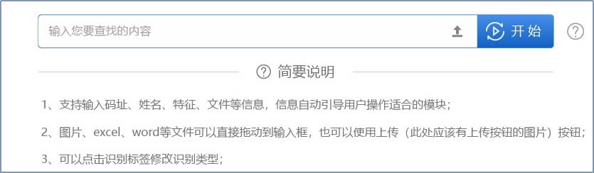 建設(shè)統(tǒng)一入口界面,實現(xiàn)用戶的多種輸入方式,包括但不限于各類碼址、名稱、地址、特征片段、數(shù)據(jù)文件、文檔文件等。支持通配符方式;支持中英文兩個語種的輸入支持和判斷,支持中英文混合輸入;支持多條信息或文件的輸入。